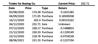Above is a a chart of the historic Boeing stock price, and a table representing trades which occured since the second quarter of 2020. There were a lot of purchases made, with seven contracts given to Boeing, one in each quarter, with an average size of $5.2Bn, this transaction history doesn't suggest foul play. Nor do the returns, out of six purchase orders only two have performed well.